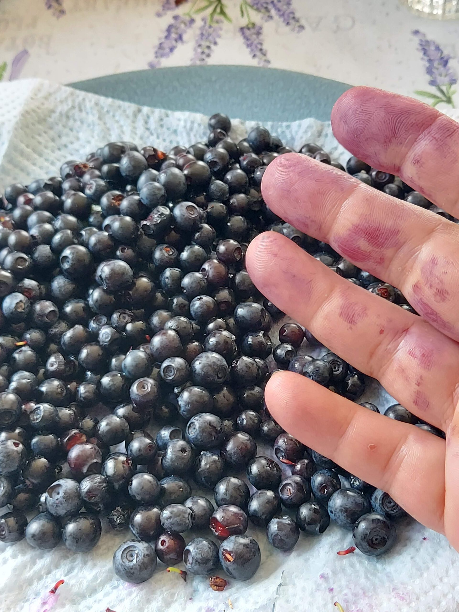 Maar we gaven niet op… 🙂 We zijn sowieso gek op wandelen dus de dag erna weer erop uit en… Tadaaa! In Brabant zouden ze zeggen: ‘Den aanhouwer wint! ‘ Met prachtig blauwe vingers, en een volle emmer naar huis! Van de bosbessen heb ik een heerlijke taart gemaakt. Een gedeelte ging de diepvries in voor later, door de yoghurt.