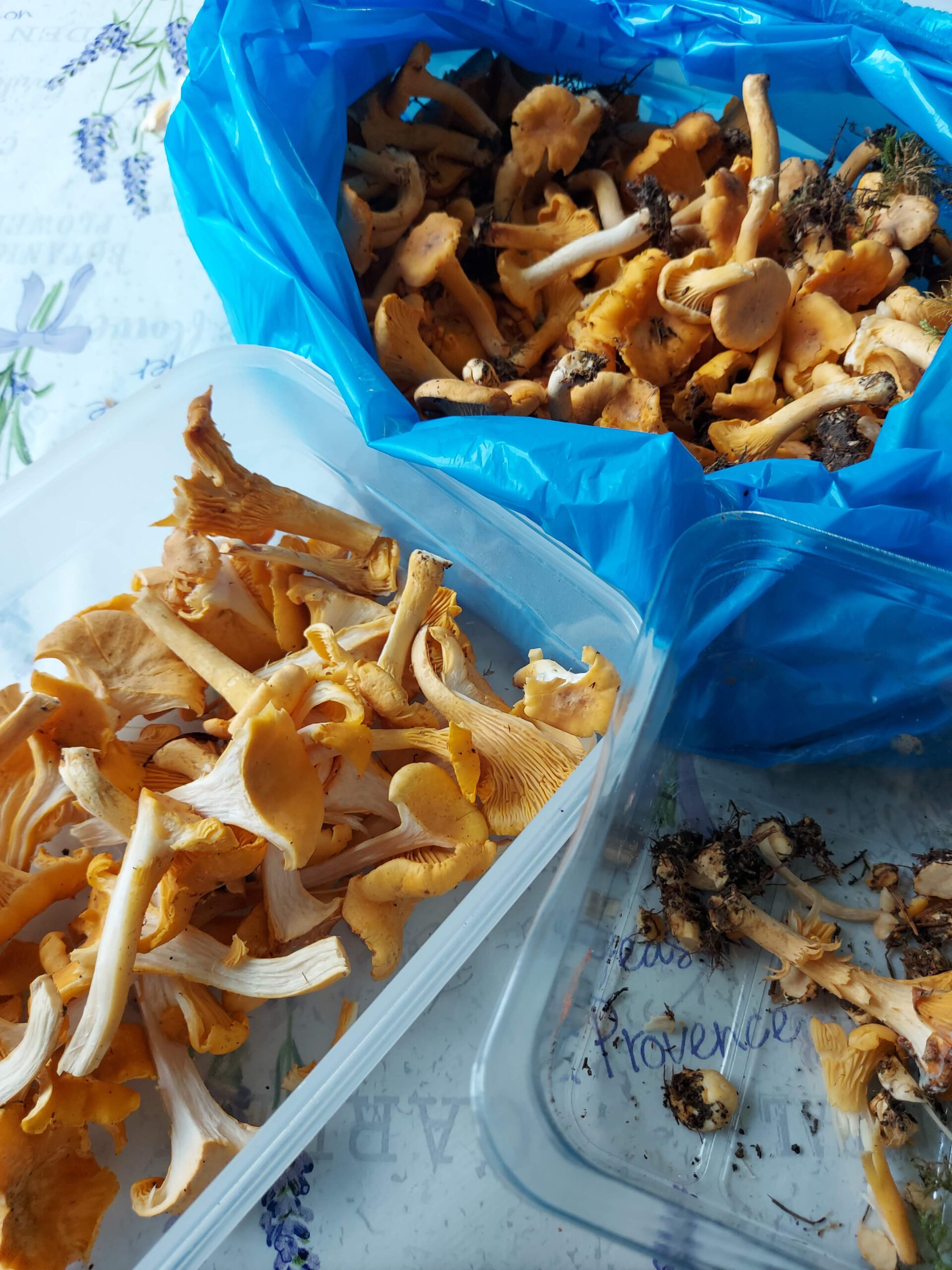 De cantharellen hebben we samen schoongemaakt, een tijdrovend klusje. Gewogen… en omdat het al laat werd zou ik ze de dag erna bakken en invriezen. Volgens onze buurman de beste manier van bewaren. ’s ochtends bleek een derde van hun gewicht verdwenen! Dus meteen geleerd, als je ze vers wil verwerken moet je snel zijn, of ze gaan volgende keer in mijn voedseldroger. Ik had er heel graag mijn diepvries mee volgestopt maar ineens waren ze toch echt niet meer te vinden. Ze blijken ook te veranderen van kleur later in het seizoen waardoor we niet zeker meer wisten of het wel cantharellen waren. Bij twijfel hebben we ze dus echt wel laten staan. Volgend jaar weten we ze nu te vinden. Omnomnom.